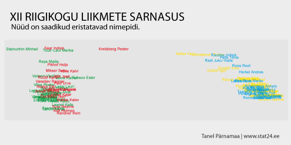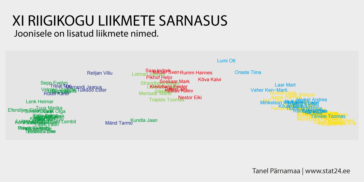 Jooniselt on näha, et üks keskerakondlane on Keskerakonna grupist küllaltki kaugel. Kes see olla võiks? Selleks vaatame joonist, kus on toodud välja ka liikmete nimed (NB! joonised, kus on toodud välja nimed, on tehtud ainult selleks, et tuvastada erindeid mitte kõiki liikmeid).