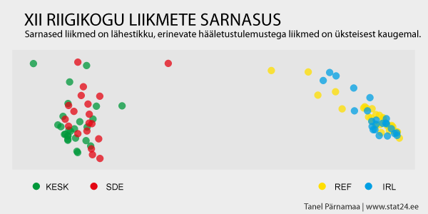 Jällegi on eristatavad 3 gruppi. Silma jääb see, et parempoolse grupi liikmed on hakanud väga sarnaselt hääletama. Vaatame sama joonist erakondade lõikes värvituna: