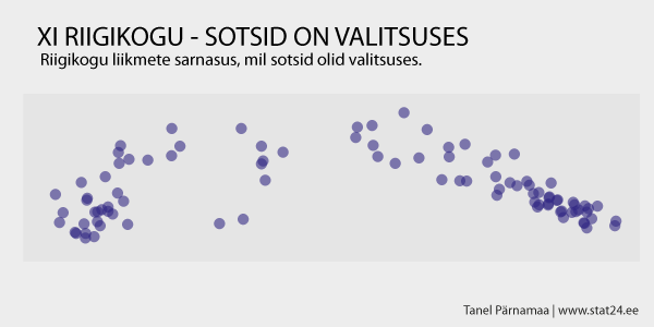 Praegu näib jooniselt, et sotsiaaldemokraadid koos rohelistega on n-ö tasakaalustavad erakonnad – sarnanevad nad ju sama palju nii Keskerakonnale kui Reformierakonnale. Uurime seda lähemalt. Mäletame, et XI Riigikogu ajal oli periood, kus ka SDE oli valitsuserakond ning periood, kus SDE oli opositsioonis. Vaatleme esialgu perioodi, kus SDE oli valitsuserakond.