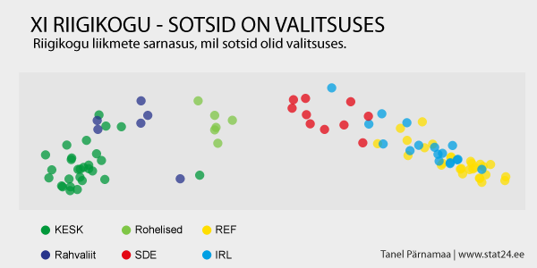 Nüüd on sotsid aga ühes leeris Keskerakonnaga. Jällegi näeme, et ainukeseks tasakaalustavaks erakonnaks on Eestimaa Rohelised. Erindite tuvastamiseks vaatame joonist koos nimedega.