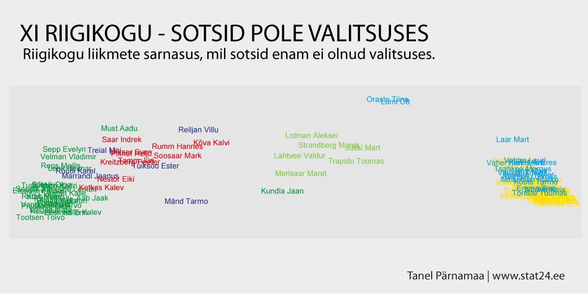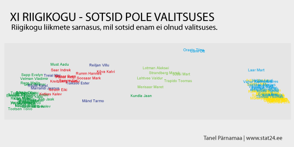 Huvitav on võib-olla ka tähelepanek, et kui eelmises postituses otsisime liiget, kes ühendab kahte gruppi, siis saime selleks liikmeks Eiki Nestor’i. Kui nüüd vaadata jooniseid “sotsidega” ja “sotsideta”, siis näeme, et kui sotsid olid valitsuses, siis Eiki Nestori hääled sarnanesid sotsiaaldemokraatide hulgast kõige rohkem IRL ja REF’ile ning perioodil, kus sotsid ei olnud enam valitsuses, on Eiki Nestor sotsiaaldemokraatidest hoopiski üks Keskerakonnale lähim liige (täpsemalt: läheduselt teine).