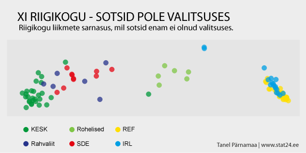 Niisiis hääletustulemuste põhjal jaotuvad riigikogu liikmed 3 gruppi. Ühe grupi võiksid moodustada äkki koalitsioonierakonnad? Aga kes moodustaksid 2 teist gruppi? Oli ju XI Riigikogus 6 erakonda – REF, IRL, SDE, KESK, Rohelised ja Rahvaliit. Ja kas on võimalik, et leidub riigikogu liige, kes on hoopis teises grupis kui enamik tema erakonnast? Selleks vaatame sama joonist, kus täpikesed on värvitud vastavalt erakonda kuuluvusele.
