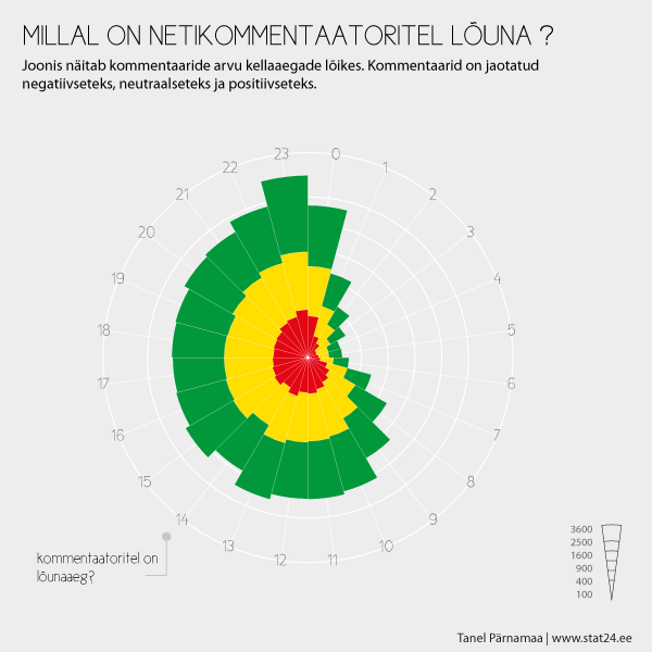 Eelnev joonis näitab, mis kellaaegadel kommentaare postitatakse. Ilmneb, et kell 13 ja 15 on rohkem kommentaare ja kell 14 vähem kui naaberkellaaegadel. Võib arvata, et kommentaaride arvu langus kella 14:00 ajal on tingitud netikommentaatorite lõunatamisest. Lõunat oodates ja lõunalt tulles on kommenteerimisaktiivsus suurem. Suurim aktiivsus on kella 23:00 – 0:00 lõikes, mis on ka loogiline, sest päeva viimane mäng lõppes 23:45.