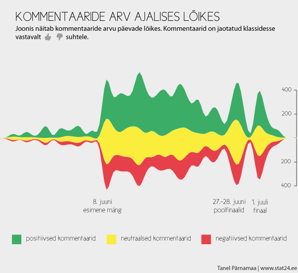 Joonis näitab kommentaaride absoluutarvu ajalises spektris. Huvitav on tähelepanek, et kommentaaride üldarv saavutab oma maksimumi EMi alguses ning EMi jooksul pigem väheneb (eufooria kustub). Lisaks näib, et poolfinaalid andsid rohkem kõneainet kui finaal.