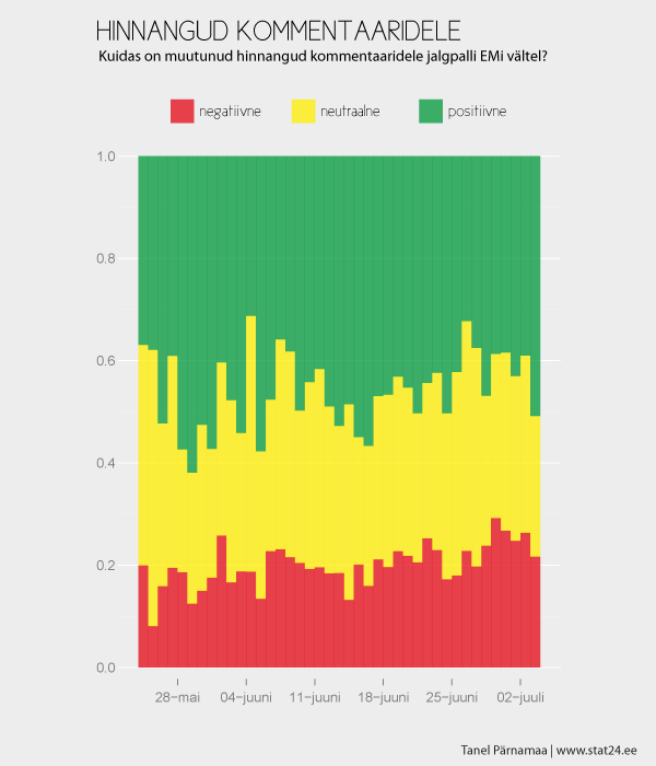 Vaadates kommentaaride sentimenti lähemalt, ilmneb väike trend, et mida lõpupoole EM jõudis, seda rohkem hakati kommentaaridele andma negatiivseid hinnanguid ja aina vähem positiivseid hinnanguid.