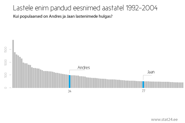 Andres on TOP34 nimi, Jaan on 77 kohal ning Rein pandi lapsele nimeks aastatel 1992-2004 vaid 37 korral ning seega vaid 298 koht. Naistenimedest on sagedasemad Sirje, Tiina ja Anne. Lastenimede statistikas ei ole ükski neist nimedest isegi TOP100 hulgas. Kohad vastavalt 667, 158 ja 201.